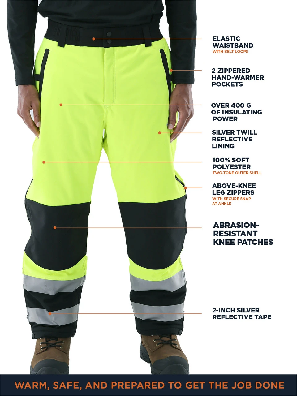Let ’em see how hard you work. These HiVis Insulated Softshell Pants give you the durability, functionality and warmth you need to get the toughest jobs done in any conditions down to -20°F. Plus, bright colors and reflective tape on these ANSI compliant HiVis insulated pants gives you the visibility you need to stay seen and stay safe in high traffic, low light or crazy weather.
