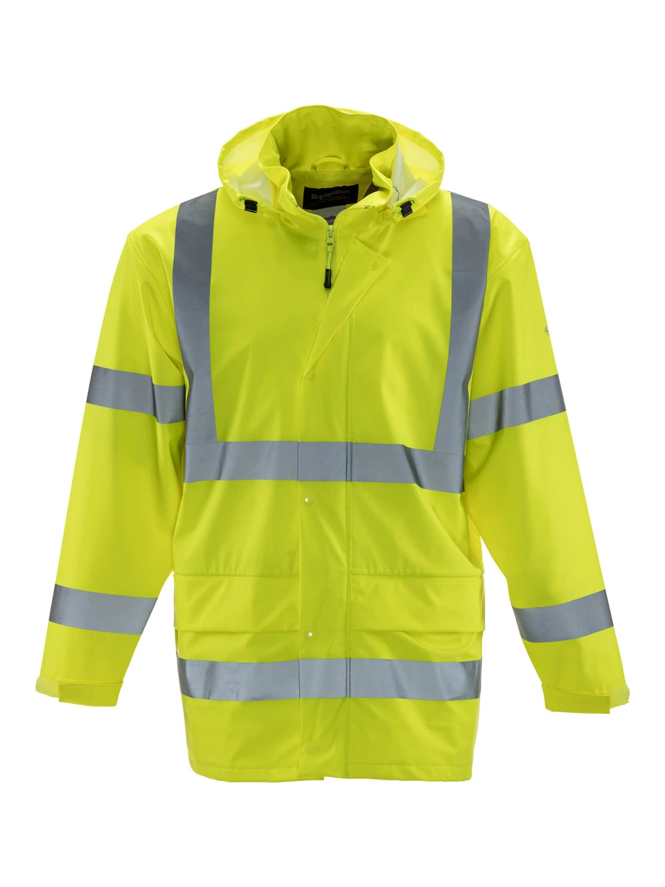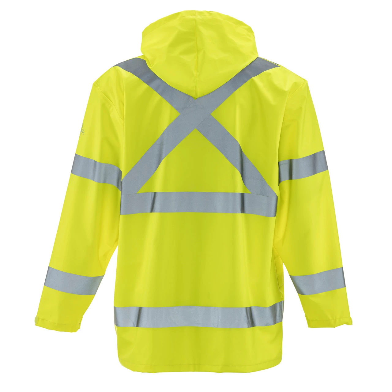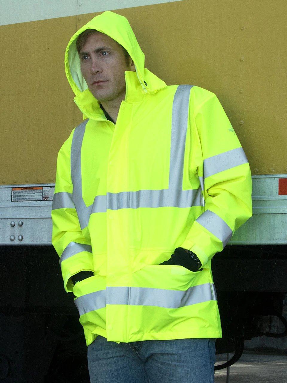 The HiVis Rainwear Jacket protects from the elements while offering enhanced safety in low-visibility conditions. Roll-in hood for added protection when you need it. Tape forms an X on the back for added safety, designating which direction the wearer is facing. Great coat for drivers and transportation professionals!