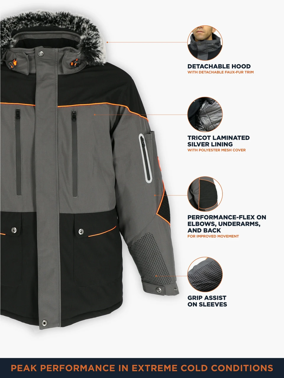 Keep out extreme winter-weather elements with this water-repellent and wind-tight men’s winter jacket. The adjustable outer cuffs, polyester insulation, and removable hood keep you heated and ready to go. Even the strongest winds won’t cut through this durable workwear. The harshest work environments are no match for this men’s jacket. Perfect for all-day shifts in freezers, it’s also the ideal winter jacket for working outside. It’s durable, warm, and just as tough as you are.