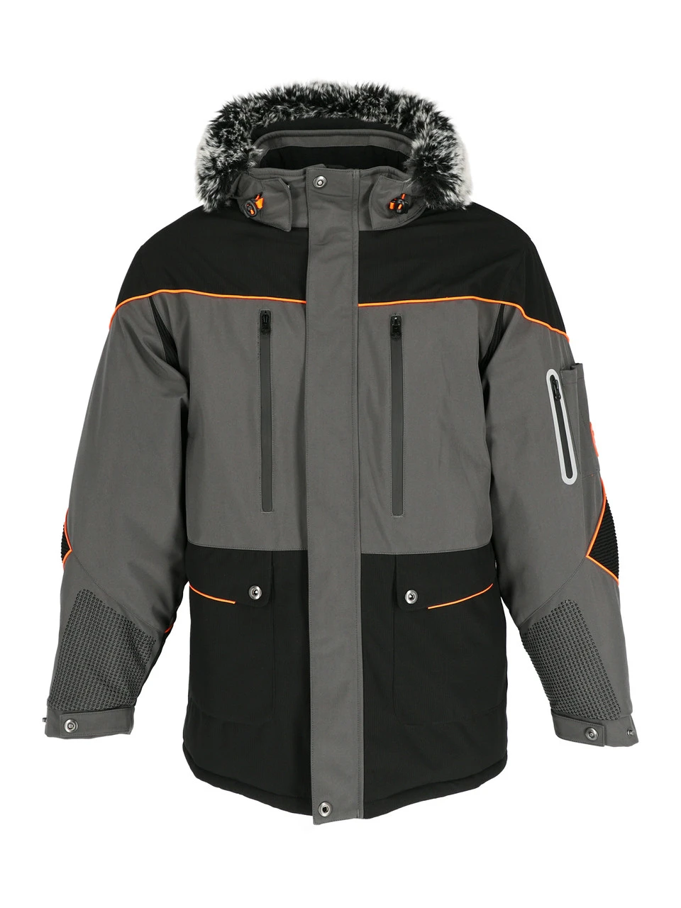 With 2 large zippered chest pockets, 1 sleeve pocket with waterproof zipper, and a 2-stall pencil pocket on the left sleeve, this men’s parka with a fur hood is multifunctional with space for everything you might need to carry at work or on the go. Casual, practical, and durable, this jacket is great for either work or play.